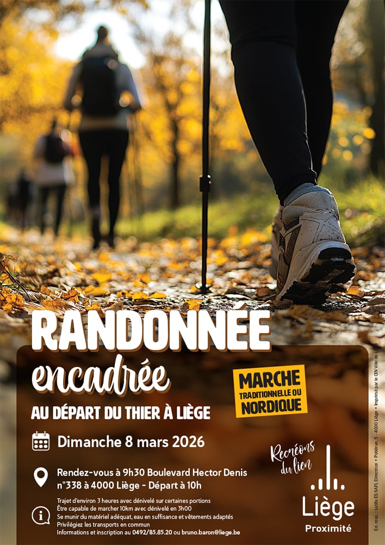 Le Service des Sports de la Ville de Liège vous invite à participer à une randonnée encadrée au départ du Thier-à-Liège. Deux formules sont proposées : marche traditionnelle ou marche nordique.