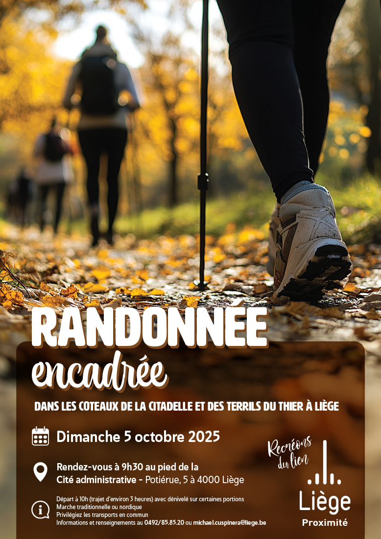 Le Service des Sports de la Ville de Liège vous invite à une randonnée de 10 km dans les Coteaux de la Citadelle et des Terrils du Thier-à-Liège.