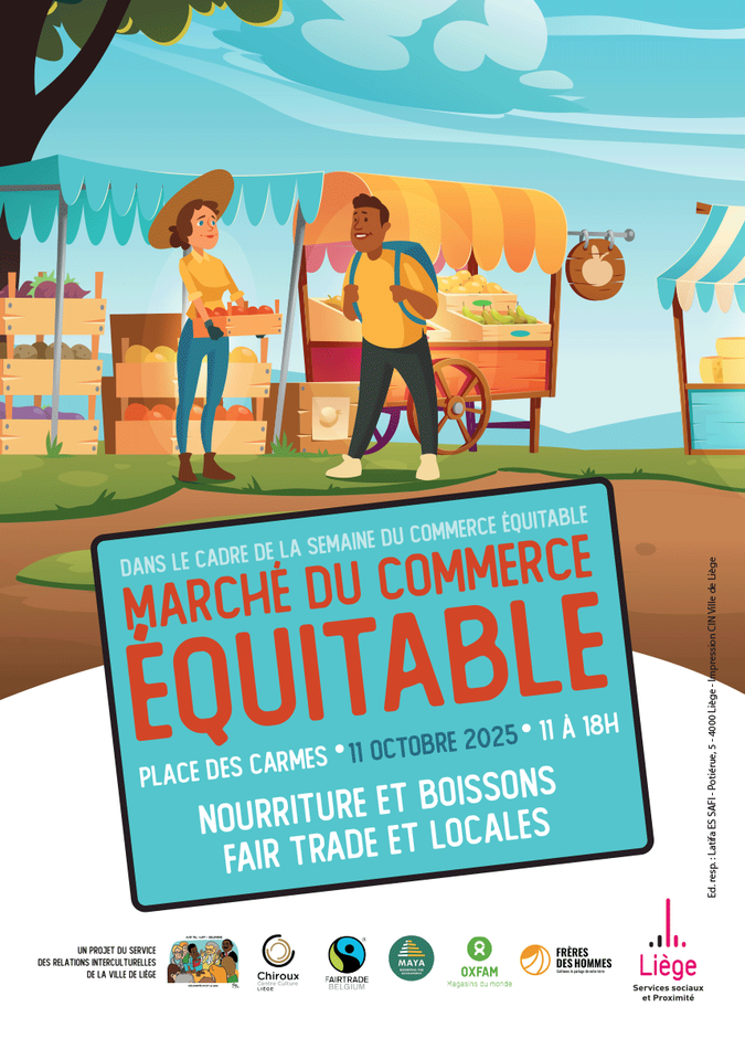 Dans le cadre de la semaine du commerce équitable, le service Interculturalité de la Ville de Liège, en collaboration avec le comité Oufti Fair Trade, organise cette année la troisième édition du marché équitable. Celle-ci se tiendra sur la place des Carmes, le samedi 11 octobre de 11h00 à 18h00.