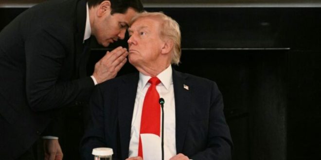Le secrétaire d’État américain Marco Rubio chuchote à l’oreille du président Donald Trump les informations sur l’évolution des négociations sur le conflit israélo-palestinien lors d’une table ronde sur Antifa dans la salle à manger d’État de la Maison Blanche à Washington, DC, le 8 octobre 2025. (Jim WATSON / AFP).