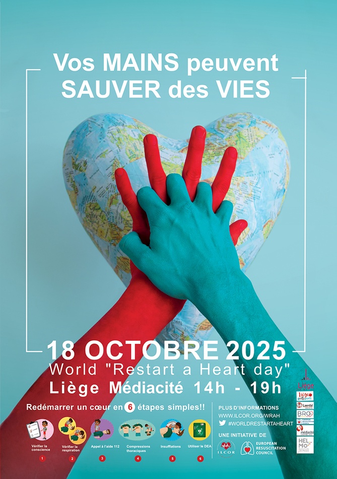 Le Samedi 18 octobre 2025, L’ASBL Liège Ville Santé et le Conseil Belge de Réanimation (BRC) organisent la Journée mondiale de la réanimation à la Médiacité de Liège de 14h à 19h. Le World Restart a Heart Day » (WRAH).