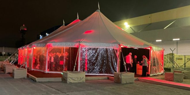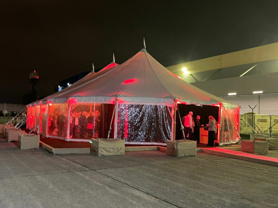 La fête des 40 ans de DHL s’est déroulée sous un chapiteau de cirque chez le logisticien aérien. Crédit : Caroline Vanbossel.