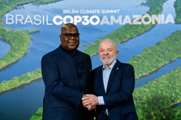 Photo diffusée par la présidence brésilienne montrant le président brésilien Luiz Inácio Lula da Silva (à droite) et le président de la République démocratique du Congo, Félix Tshisekedi, posant pour une photo avant la séance plénière générale des dirigeants dans le cadre de la COP30, la Conférence des Nations Unies sur les changements climatiques, à Belém, dans l’État du Pará, au Brésil, le 6 novembre 2025. (Ricardo STUCKERT / Brazilian Presidency / AFP).