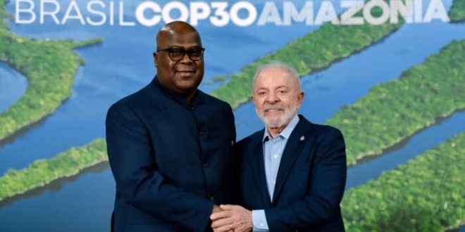 Photo diffusée par la présidence brésilienne montrant le président brésilien Luiz Inácio Lula da Silva (à droite) et le président de la République démocratique du Congo, Félix Tshisekedi, posant pour une photo avant la séance plénière générale des dirigeants dans le cadre de la COP30, la Conférence des Nations Unies sur les changements climatiques, à Belém, dans l’État du Pará, au Brésil, le 6 novembre 2025. (Ricardo STUCKERT / Brazilian Presidency / AFP).