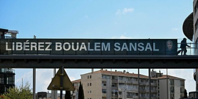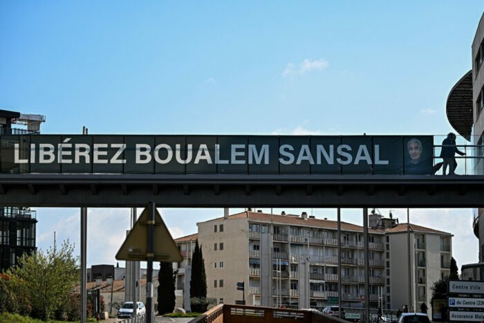 Une banderole de soutien à l’écrivain franco-algérien Boualem Sansal, détenu en Algérie, est déployée sur un pont à Béziers, dans le sud de la France, le 26 mars 2025. (GABRIEL BOUYS / AFP).