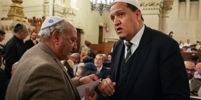 L’imam franco-tunisien de la mosquée municipale de Drancy, Hassen Chalghoumi (à droite), actuel Président de la Conférence des Imams de France, ici, le 10 octobre 2023, participant à un rassemblement de solidarité avec Israël suite aux attaques du Hamas, à la Grande Synagogue de Paris, dite Synagogue de la Victoire. Thomas SAMSON / AFPGENEVE. Des organisations européennes ont manifesté dimanche soir dernier, devant le siège des Nations Unies à Genève, pour protester contre ce qu’elles ont qualifié de « pénétration des organisations des Frères musulmans » en Europe, à travers ce qu’elles considèrent comme des organisations humanitaires et politiques cachant derrière elles l’agenda des Frères musulmans.