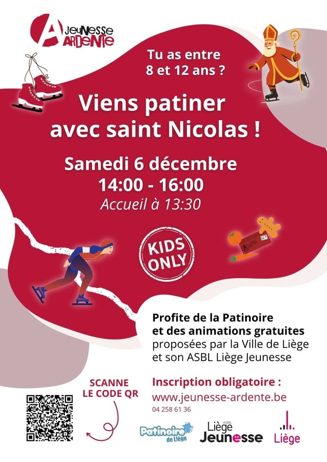 Si tu as entre 8 et 12 ans, viens rejoindre Saint-Nicolas sur la glace pour une heure de patinage encadrée par les membres du Cercle des Patineurs Liégeois Artistiques (CPLA), participe aux animations qui te seront proposées par le Service Jeunesse de la Ville de Liège et déguste un goûter 100 % sain et liégeois, le tout dans une ambiance divertissante, conviviale et musicale.