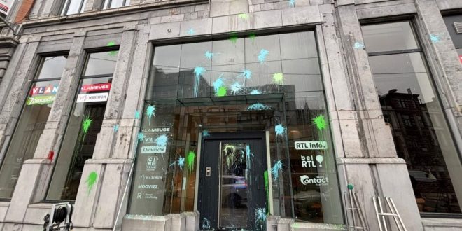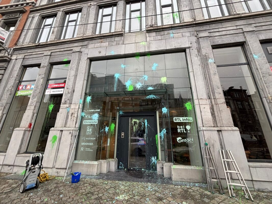 Jeudi 27 novembre 2025, la devanture de La Meuse à Liège garde encore les stigmates du passage d’une horde de manifestants violents qui ont dégradé le bâtiment la veille. La justice doit sanctionner. Crédit : La Meuse.