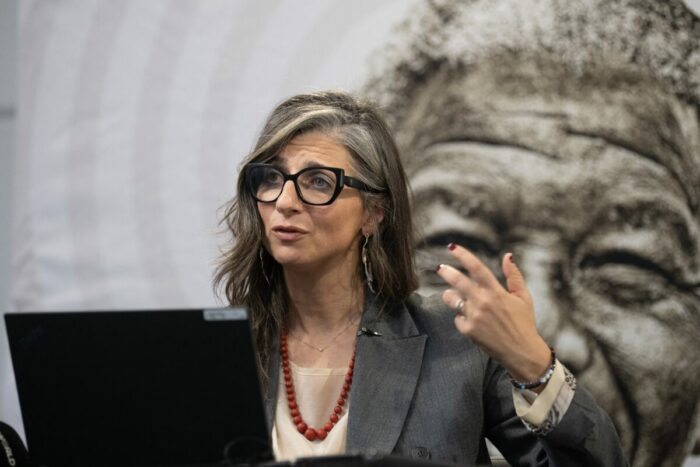 La rapporteuse spéciale des Nations Unies sur la situation dans les territoires palestiniens occupés, Francesca Albanese, assise devant un portrait de Nelson Mandela, s’adresse à la presse après la présentation à distance de son dernier rapport à l’Assemblée générale de l’ONU, au Cap, le 28 octobre 2025. (RODGER BOSCH / AFP).
