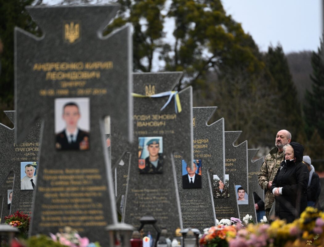 (Des habitants se recueillent devant les tombes de soldats ukrainiens au cimetière Lychakiv, à Lviv, le 6 décembre 2025, Journée des forces armées ukrainiennes, alors que l’Ukraine est envahie par la Russie. YURIY DYACHYSHYN / AFP).