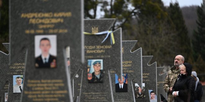 (Des habitants se recueillent devant les tombes de soldats ukrainiens au cimetière Lychakiv, à Lviv, le 6 décembre 2025, Journée des forces armées ukrainiennes, alors que l’Ukraine est envahie par la Russie. YURIY DYACHYSHYN / AFP).