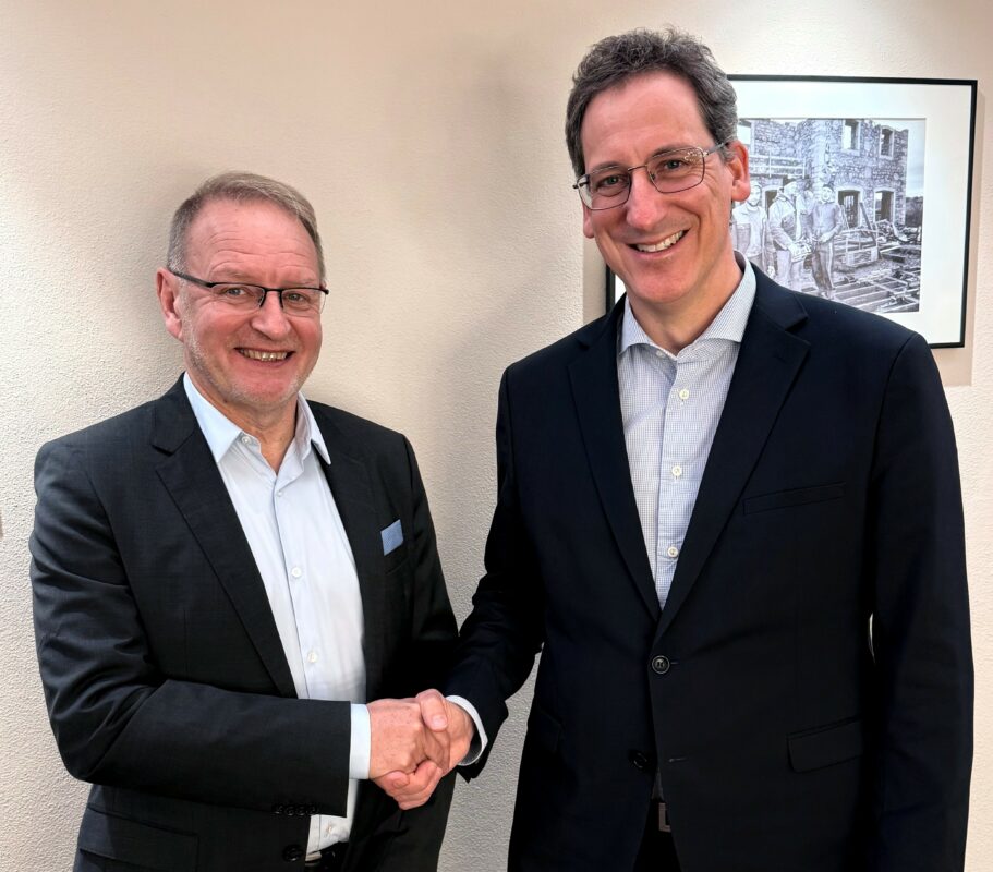Le Français François Michel (à droite sur la photo) passe le flambeau de la direction de John Cockerill à son prédécesseur (à gauche). Photo : DR.