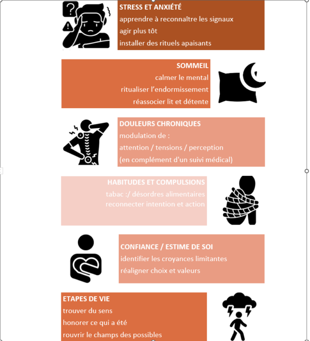 Comment ? le praticien accompagne vers un état d’“ouverture” (respirations, visualisations, métaphores). La personne perçoit ses mécanismes internes sous un autre jour, y met du sens et agit avec toute son intentionnalité.