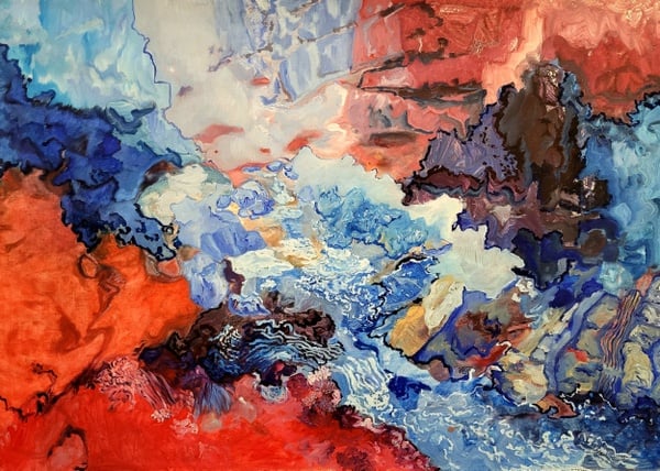 Visuel : Maud LE BEL, Coule une rivière, bleue, huile et acrylique sur toile de lin, 100 x 150 cm, 2024