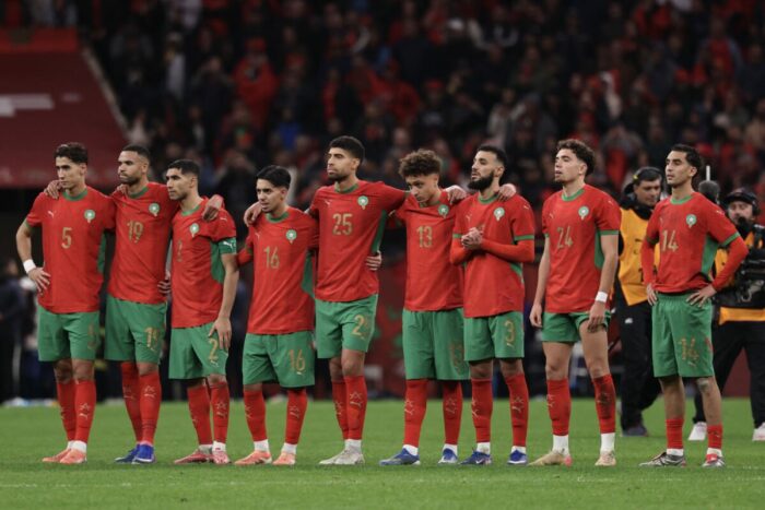 L’équipe du Maroc alignée lors de la séance de tirs au but de la demi-finale de la Coupe d’Afrique des Nations (CAN) opposant le Nigeria au Maroc au stade Prince Moulay Abdellah de Rabat, le 14 janvier 2026. (FRANCK FIFE / AFP).