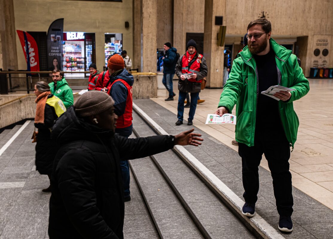 (Des syndicalistes distribuent des tracts aux usagers de la gare de Bruxelles-Central, le premier jour d’une grève de cinq jours de la SNCB, en plein cœur de Bruxelles, le lundi 26 janvier 2026. Photo : Emile Windal/BELGA).