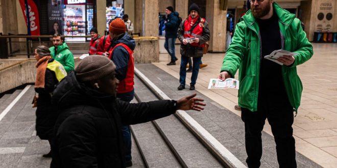 (Des syndicalistes distribuent des tracts aux usagers de la gare de Bruxelles-Central, le premier jour d’une grève de cinq jours de la SNCB, en plein cœur de Bruxelles, le lundi 26 janvier 2026. Photo : Emile Windal/BELGA).