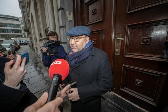 (Le président du MR, Georges-Louis Bouchez, arrive mardi 10 février 2026, à Bruxelles pour le début du conclave en vue de la formation d’un gouvernement bruxellois. Photo : BELGA).