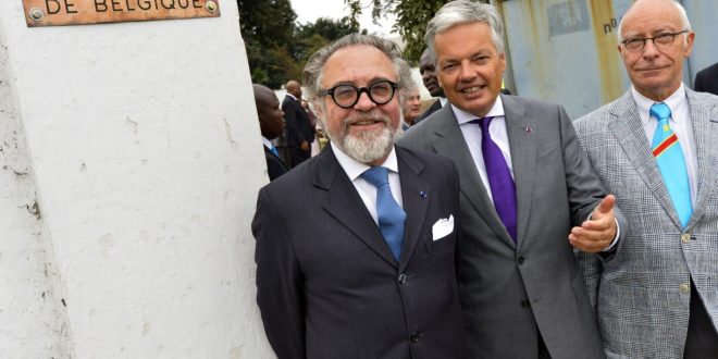 (De gauche à droite : l’ambassadeur de Belgique en RDC, Michel Latschenko, le vice-Premier ministre et ministre des Affaires étrangères, Didier Reynders, et l’expert belge pour la RDC, Jean-Claude Fontinoy, sont photographiés en août 2013 sur le site de la future ambassade de Belgique, boulevard du 30 Juin à Kinshasa, en RDC. Photo : Benoît Doppagne/BELGA).