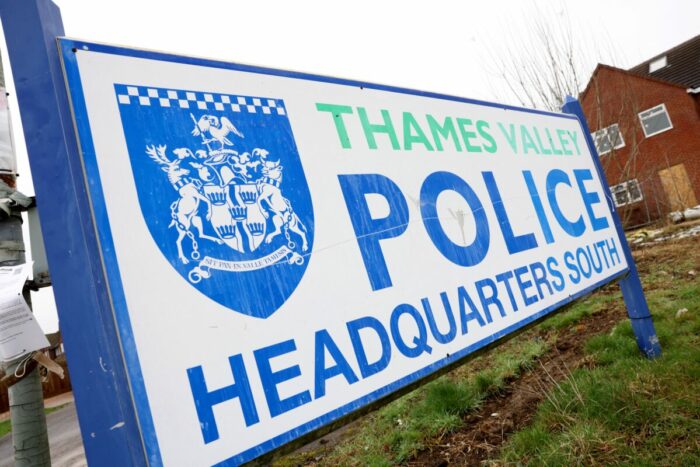 Une pancarte est visible devant le quartier général de la police de la vallée de la Tamise à Kidlington, au sud-ouest de Londres, le 19 février 2026. L’ancien prince Andrew a été arrêté le 19 février 2026, soupçonné d’inconduite. (Toby Shepheard / AFP).