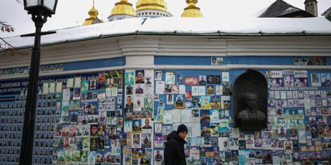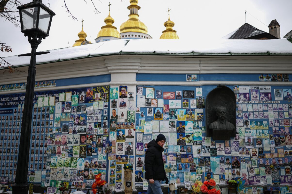 (À Kiev, le 23 février 2026, une personne longe le Mur du Souvenir des soldats ukrainiens tombés au combat, alors que le conflit avec la Russie atteint son quatrième anniversaire. HENRY NICHOLLS / AFP).