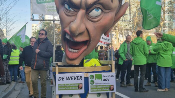 Caricature de Bart De Wever lors d’une manifestation conjointe à Bruxelles pour dénoncer les mesures « injustes et inhumaines » du gouvernement fédéral, le jeudi 12 mars 2026. (BELGA PHOTO TIMON RAMBOER).
