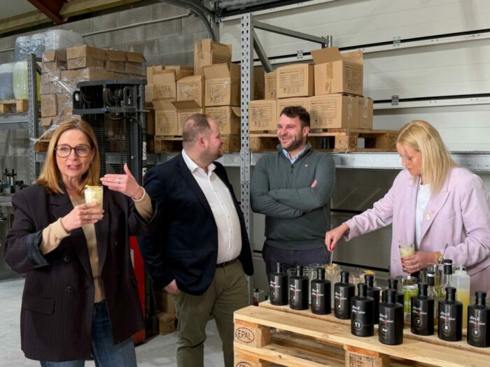 (De gauche à droite, Loïc Leroy, copropriétaire de la Distillerie du Fays; Christine Schréder, Jérôme Leduc, copropriétaire de la Distillerie du Fays; Julie Nullens et Nathalie Charlier. D.R.)