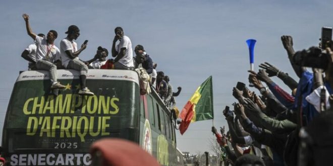 Les joueurs de l’équipe nationale sénégalaise de football saluent une foule de supporters à bord d’un bus décapotable lors du défilé du trophée dans les rues de Dakar, le 20 janvier 2026, pour célébrer la victoire du Sénégal à la Coupe d’Afrique des Nations (CAN) organisée au Maroc. (NICOLAS REMENE / AFP).