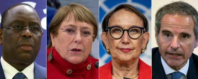 Ce montage photo, réalisé le 16 avril 2026, montre (de gauche à droite) le président sénégalais Macky Sall, la Haut-Commissaire des Nations Unies aux droits de l’homme et ancienne présidente chilienne Michelle Bachelet, la Secrétaire générale de la CNUCED, Rebeca Grynspan, et le directeur général de l’Agence internationale de l’énergie atomique (AIEA), Rafael Grossi. (Fabrice COFFRINI, Juan Mabromata, Cris BOURONCLE, Simon Wohlfahrt / AFP).